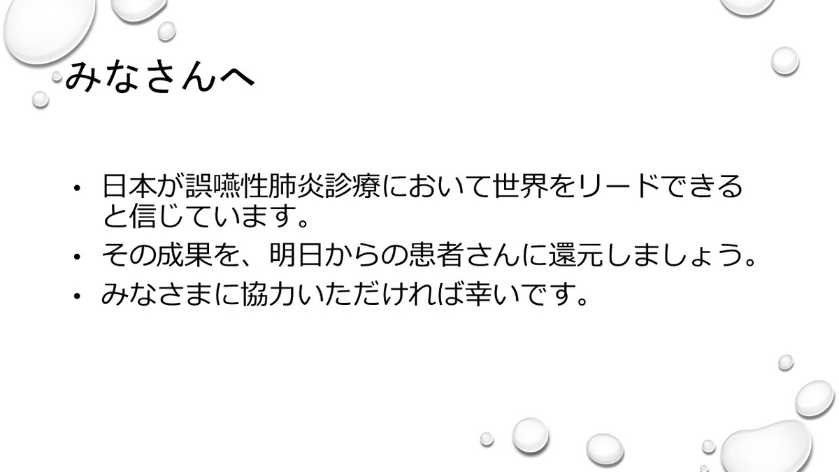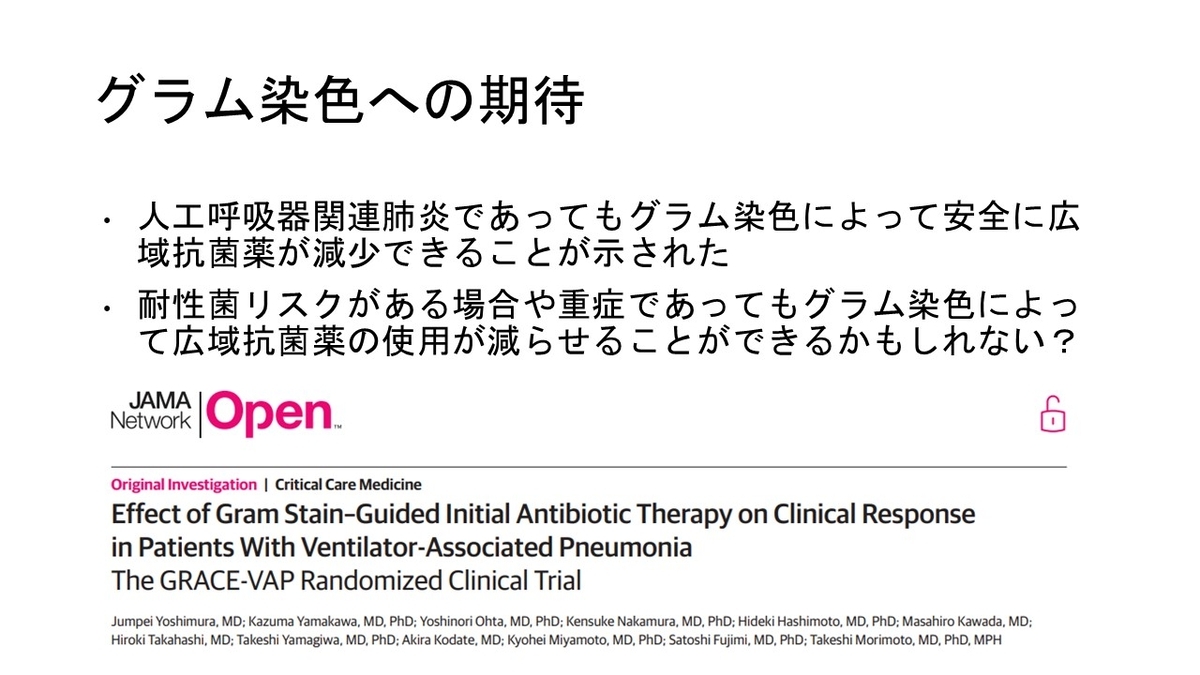 あとは、グラム染色の話も少し盛り上がりました。グラム陰性菌が脱色されるのは、脂肪膜の外側しか染色されないので、アルコールで用意に外側が剥がれて中身が出てくるからと。。勉強になりました。グラム染色を発明したグラムさんは非常に思慮深いひとで、結局彼の発明した方法がずっと変わらず使われていることからも、その偉大さがわかると。。誤嚥性肺炎のグラム染色研究もやはり、必要だなと。