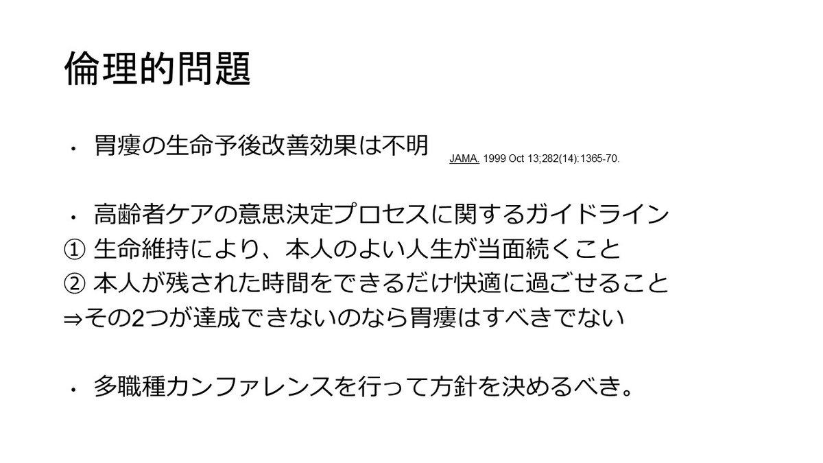 最後に、胃ろうのレクチャーを外科医の先生がされていました。胃ろうは米国でもしているのだなーという当たり前の感想ですが、胃ろうの合併症について詳しく話をされていました。バンパー症候群など。ただ、そもそも胃ろうを認知症の高齢者に使うのかという突っ込んだ話はあまりできませんでした。そこは気になるところです。ただ、外科医の先生からレクチャーがある点も新鮮です。